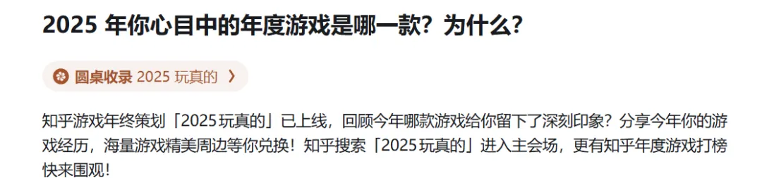 知乎官方自然也了解到了玩家的需求,今年顺势发起了“2025 玩真的”年度游戏&年度游戏人物评选活动,把年度盘点和评选的权利交给玩家,同时还召开了线上同名圆桌讨论。上面的优质回答,便来自于这场圆桌问答。