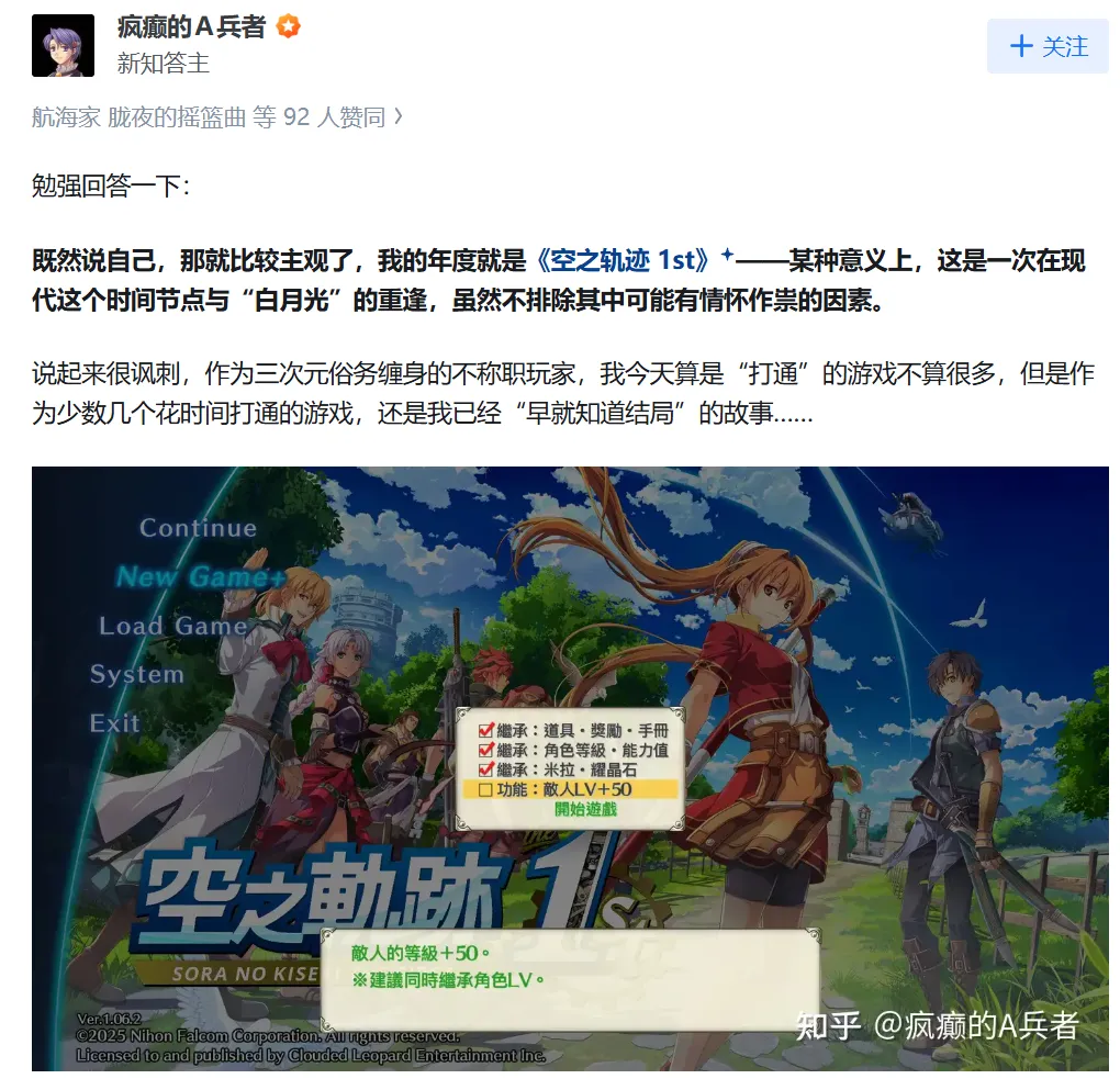 你压根猜不到,点赞最高的一篇答主的年度游戏,竟然是日本Falcom(又称法社)的经典重制作品《空之轨迹 1st》。