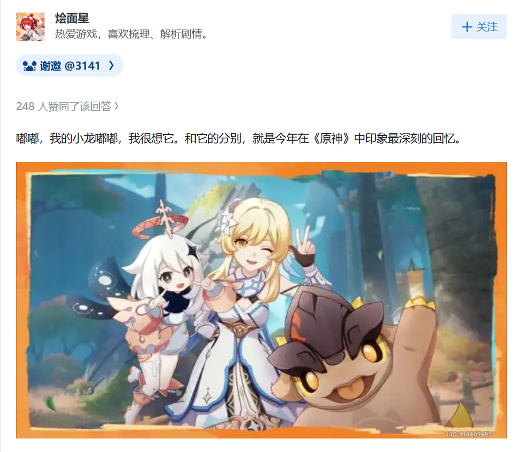 我们能从玩家的回答中,梳理起这一年来游戏更新的脉络。就拿《原神》来说,上半年龙选者系列任务与小龙嘟嘟结下的羁绊,便成为了玩家们珍贵的回忆。
