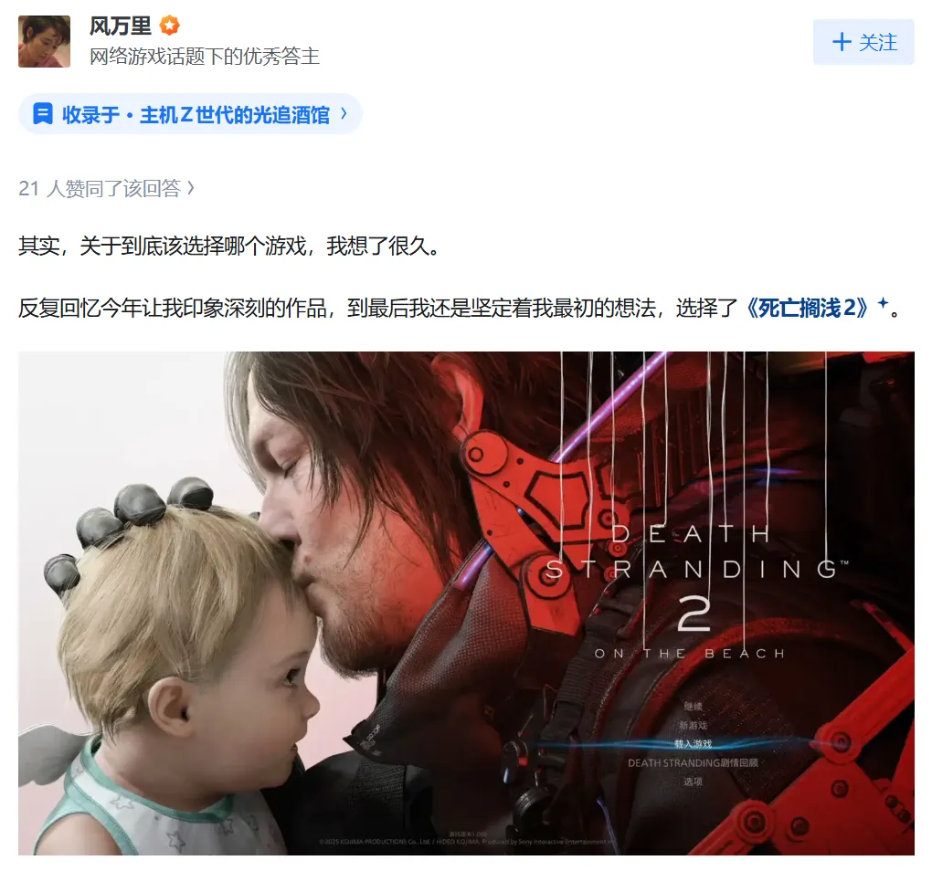 有的人在为小岛秀夫鸣不平,认为《死亡搁浅2:冥滩之上》才是自己的年度游戏,知乎答主风万里感慨道:“这个来自人心的故事,像一簇穿越冥滩的星火,能穿透寒冬的寒意,直抵更多人的心灵。”