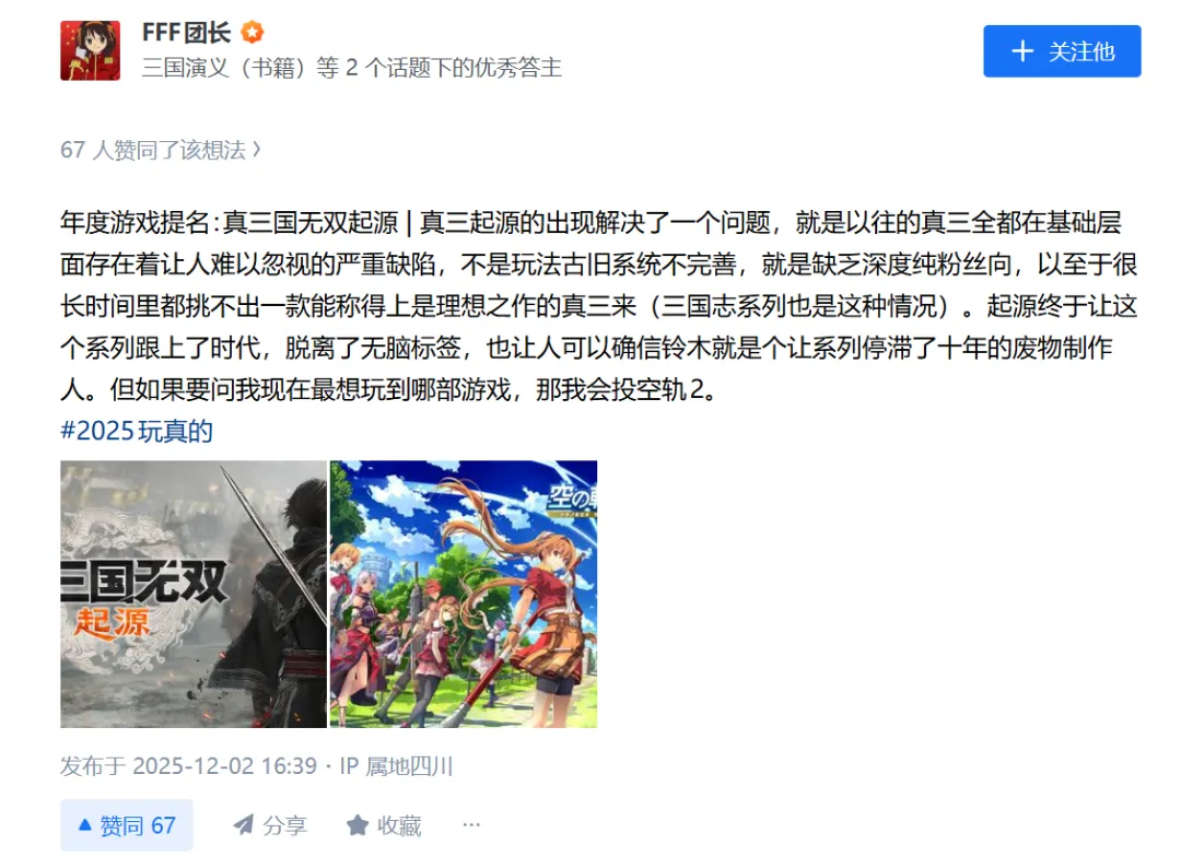 在“2025年最被低估的游戏”讨论中,知乎答主Benedict Fu称肯定会提名《真·三国无双:起源》,“真三国无双起源是我今年在PS5上玩的时间最长的游戏,也是今年唯一一款白金的游戏”。