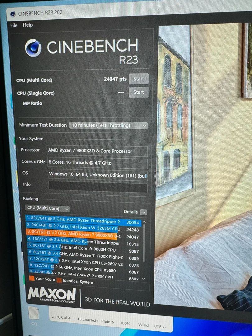 R23 多核 10分钟,24047分,对于PBO来说这分数已经很好了,温度表现和电压也正常范围内。