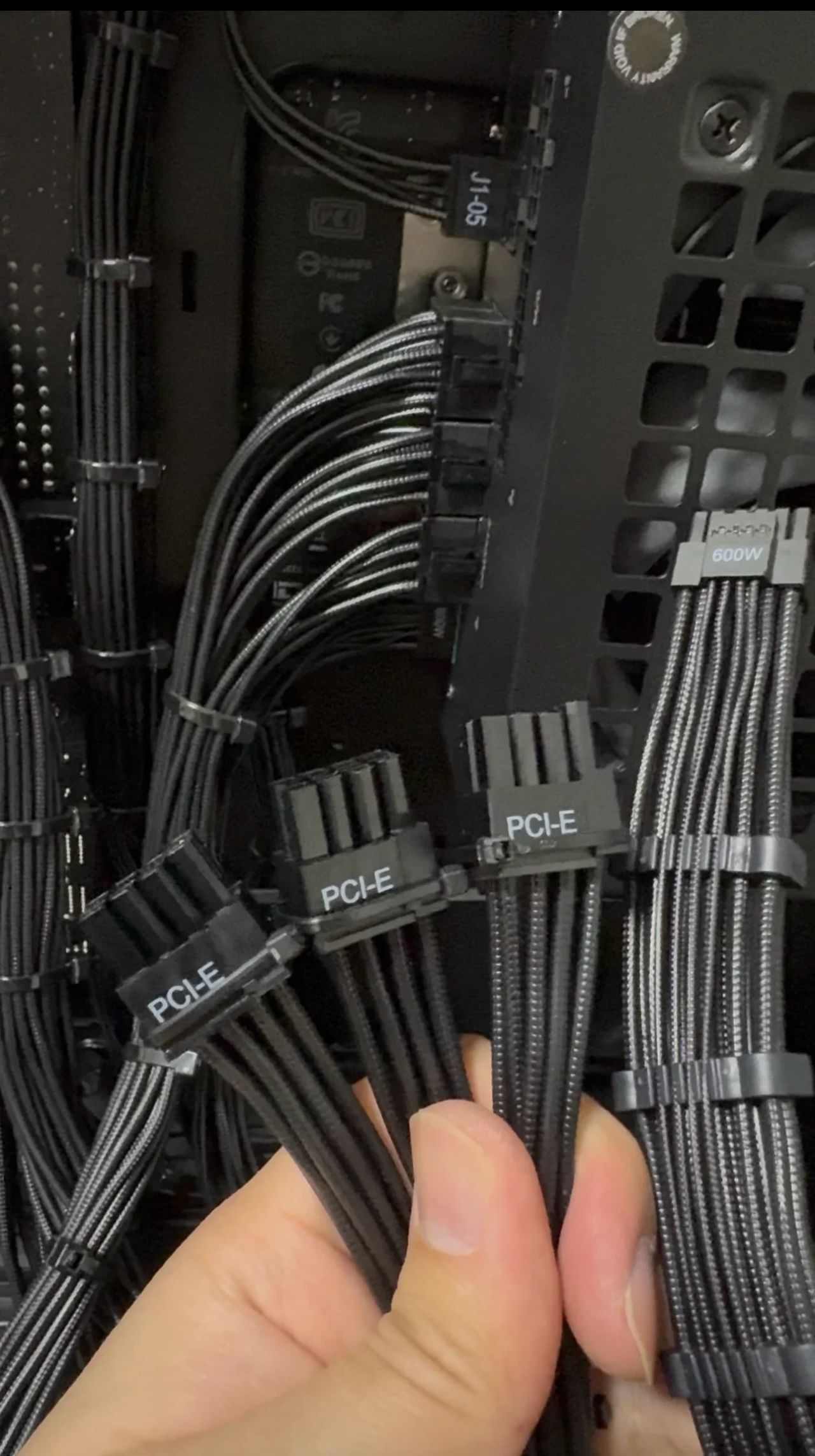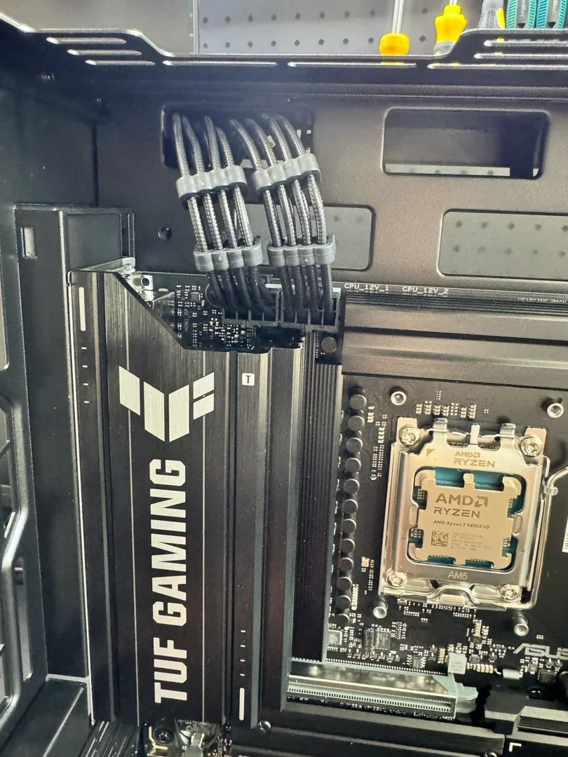 预留的3根8PIN显卡供电线,接头已经扎好,直接插自备的显卡上即可,右边是12V-2×6的显卡供电线,后续更新显卡使用。