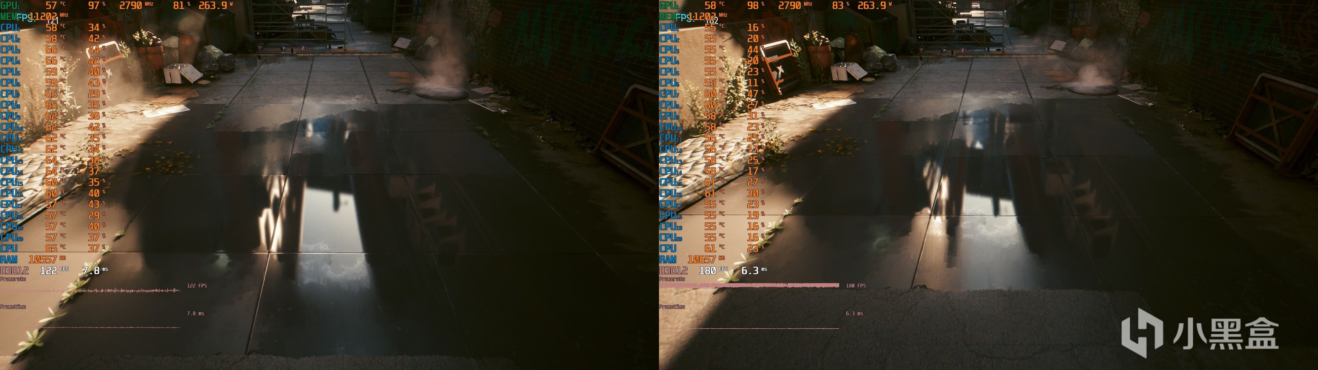 ▼換到室外的水灘的遊戲場景,水灘裏的光追特效一樣真實,四周的環境效果基本沒區別,甚至開啓DLSS Frame Generation選項之後的遊戲畫面,有種更加清晰的感覺。另外,開啓DLSS Frame Generation選項之後,可以明顯遊戲幀數曲線更加祕籍,且幀延遲顯著降低。