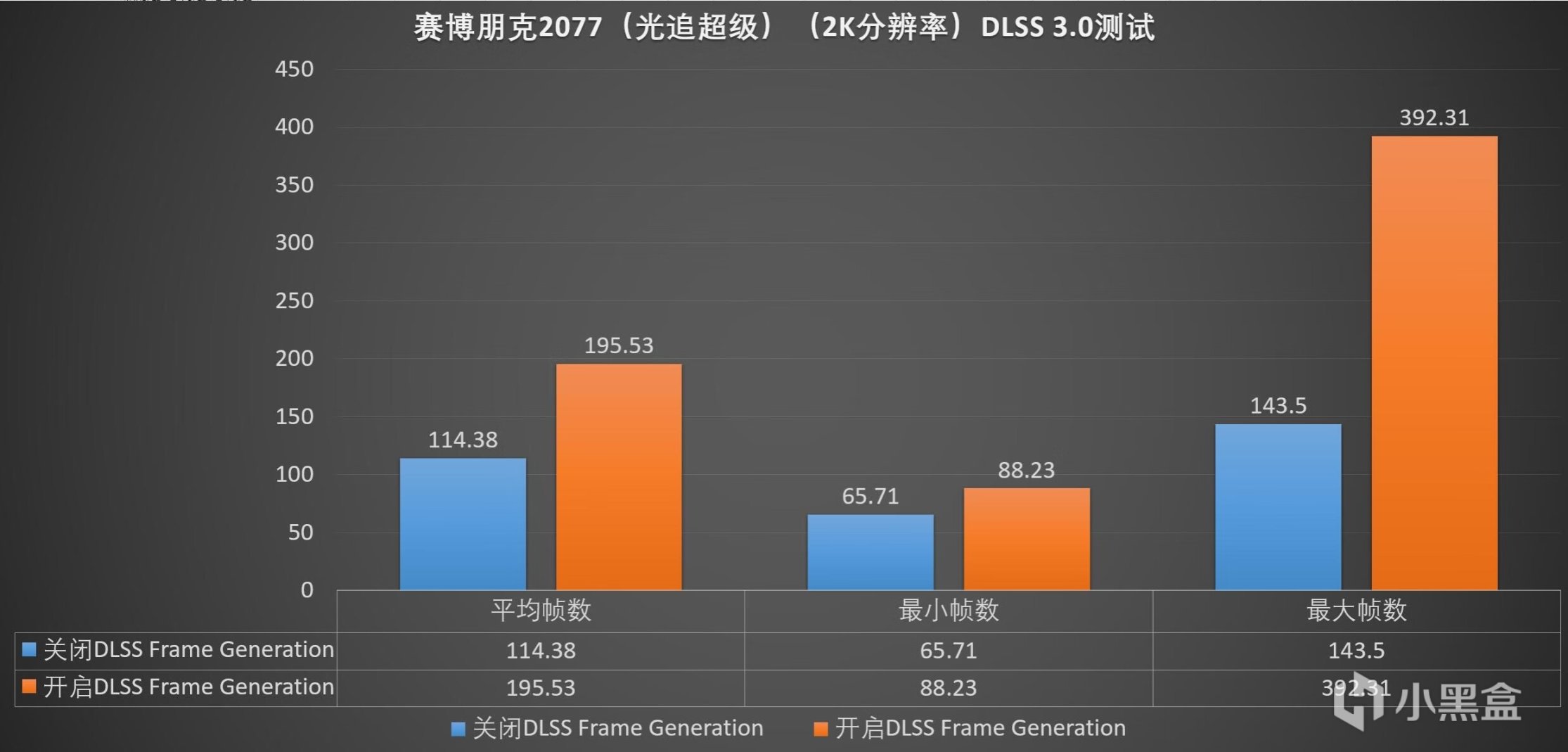 ▼關閉DLSS Frame Generation選項,整體的遊戲平均幀數在114.38幀,開啓DLSS Frame Generation選項,遊戲幀數提升非常明顯,去到了195.53幀,提升巨大!