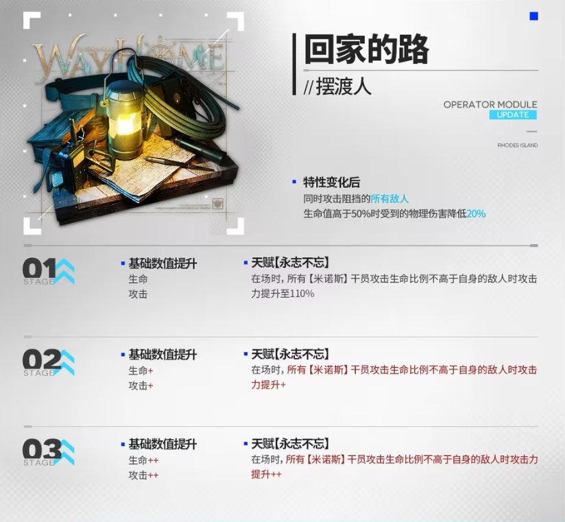 5星摆渡人模组不用开。生命值高于50%时受到的物理伤害降低20%。推测在场时,所有【米诺斯】干员攻击生命比例不高于自身的敌人时攻击力提升120%