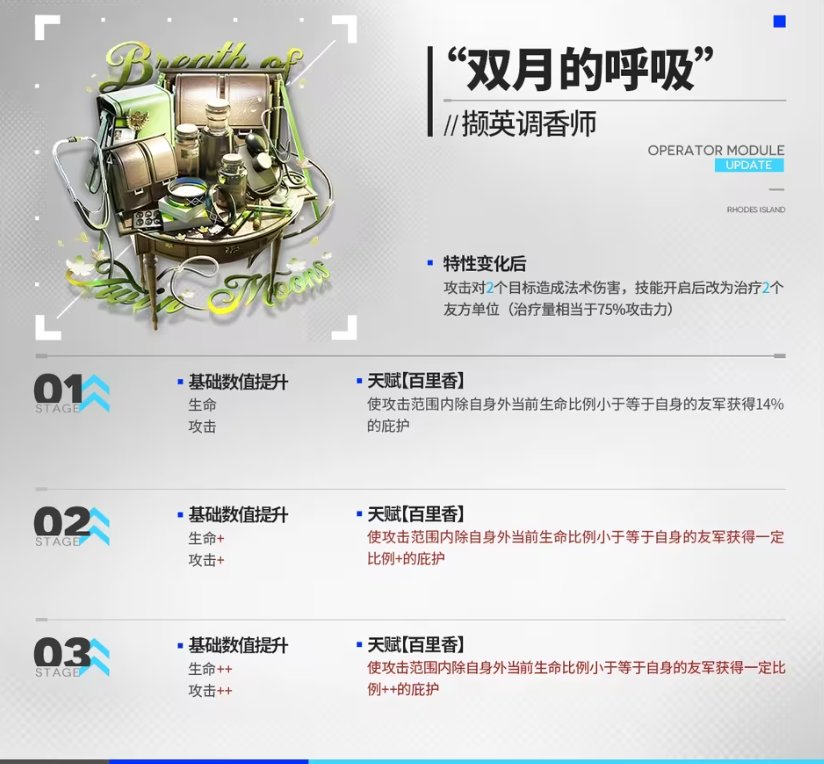5星撷英调香师模组不用开。奶2打2。使攻击范围内除自身外当前生命比例小于等于自身的友军获得一定比例的庇护。之前我推测的14%,没想到还真是。估计3模是18%