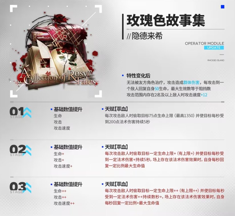 6星隐德来希模组可以开。攻击范围内存在2名及以上敌人时攻击速度+12。推测每次攻击敌人时偷取目标100生命上限(最高1800)并使目标每秒受到300法术伤害持续6秒,场上存在该法术伤害效果时,自身每秒回复2%最大生命值。看给的回血数值了。总体是比1模强的。攻速我猜是+7