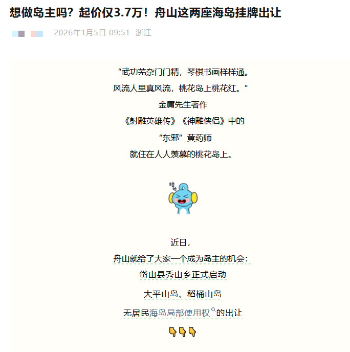 大家想玩“海岛奇兵”——不,是想当“海岛大亨”吗?最近,浙江有两座无人海岛正在挂牌出让,起拍价仅3.7万元: