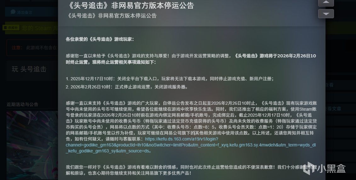 《头号追击》非网易官方版本,也就是steam版,将于2026年2月26日10时终止运营!