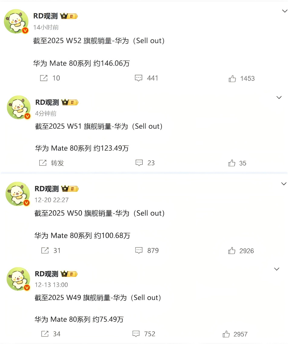 华为mate80系列开卖已超一个月,到底卖出了多少?根据第三方博主“RD观测”提供的数据,截至2025年W52,mate80全系销量约为146.06万。