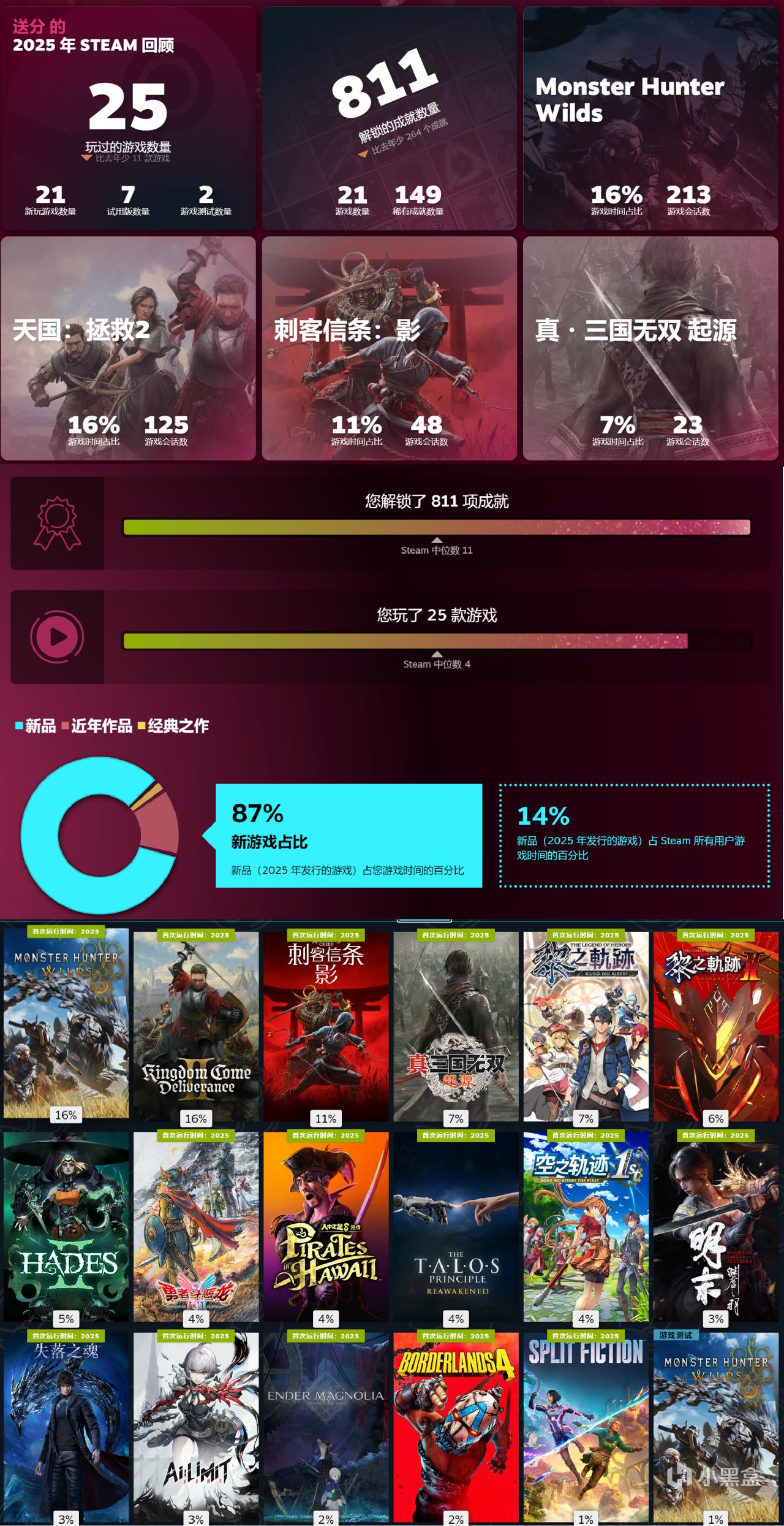 Steam上买的比24年多了1k但是玩得数量少了很多,一些chill的小游戏或者小体量独有基本没时间玩了。当然也有无主4这种闪退玩不了、寂静岭f天外世界2丝之歌等等没排出档期有些遗憾。
