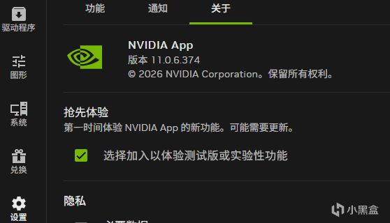 首先打开nvidia APP,在设置--关于--勾选体验测试版