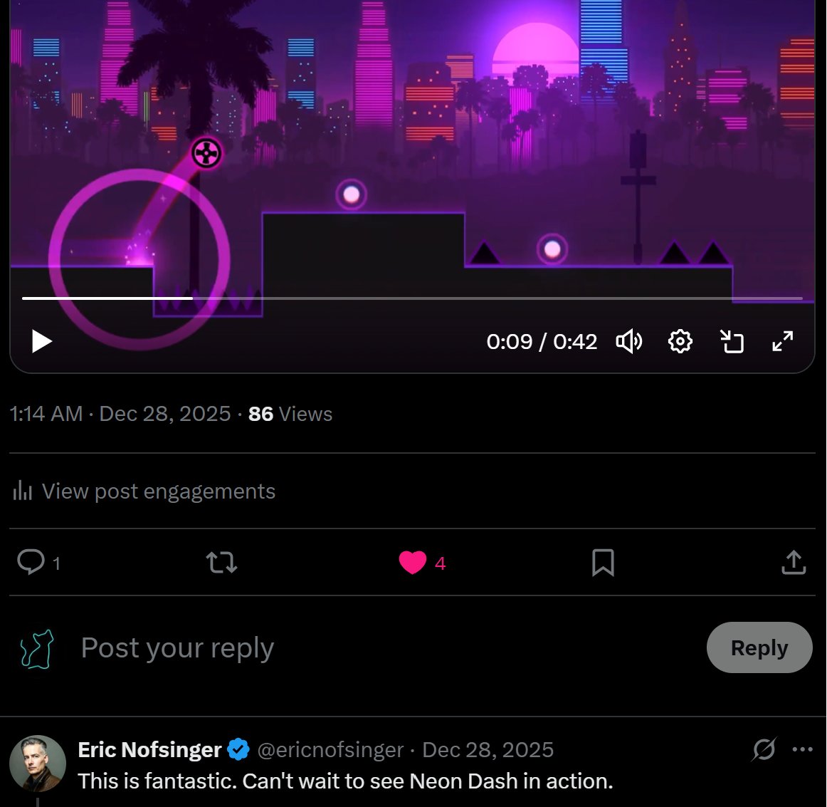 推文里的游戏是一款复古未来风格的节奏+平台跳跃游戏,复古未来即通过描绘过去人们想象中的未来世界, 表达我们对过去的向往,对现代生活的疏离感,以及对未来的迷茫