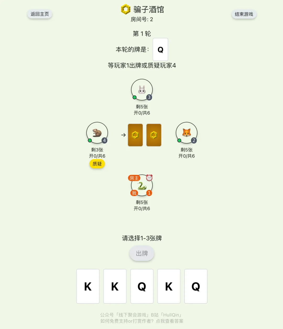 此外,如果某位玩家出完牌了,遊戲依然繼續。直到總共N-1個人出完牌(遊戲總人數爲N),那麼,最後剩下的那個人,必須【質疑】,按照質疑的結果,有人將接受懲罰。