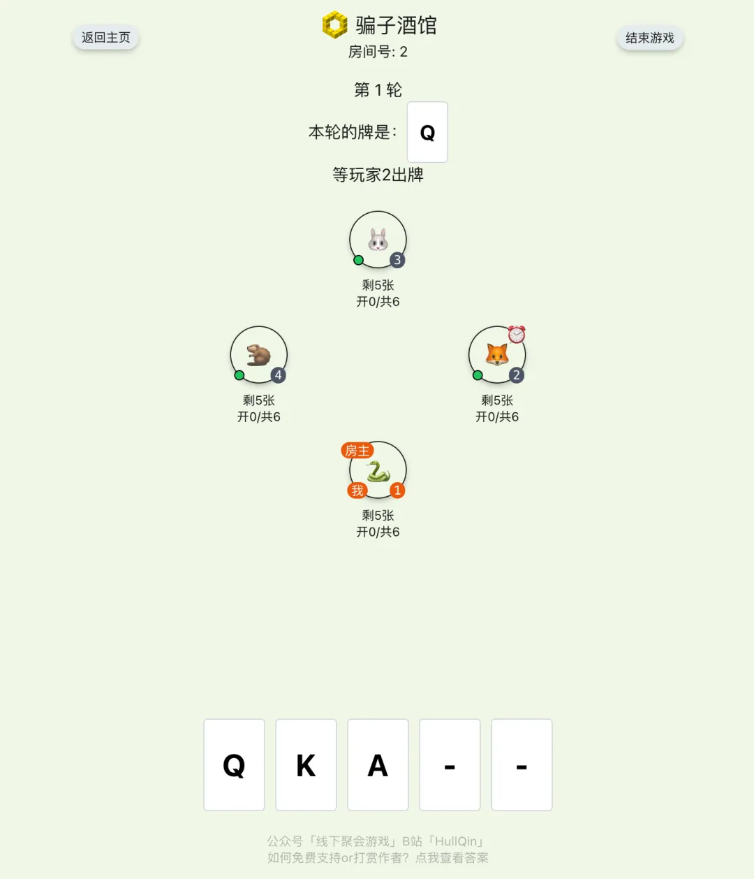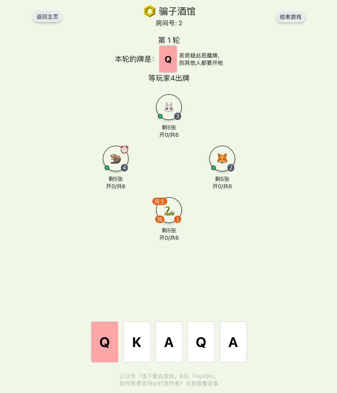 從QKA中隨機選一張,作爲「本輪遊戲要出的牌」。然後將20張牌給每人發5張牌(若人數不足4,則剩餘的牌本輪不會使用,大家都不知道剩餘的牌是什麼)