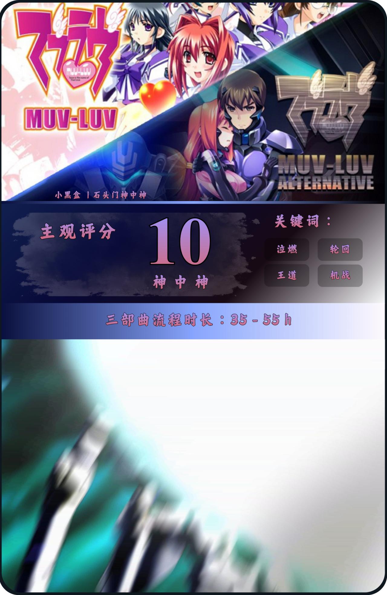 《Muv-Luv》包含前两部Extra和Unlimited,流程加起来差不多15 - 20 小时。Alternative则差不多