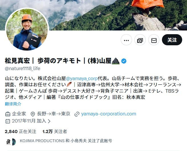 (【松見真宏】歩荷のアキモト┃(株)山屋(@nature1118_life))