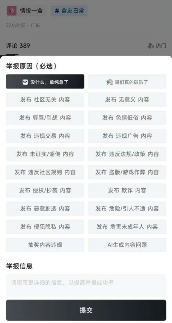 甚至,这里的举报页面里还专门设置了两个举报原因——“没什么,单纯急了”和“哥们真的破防了”。