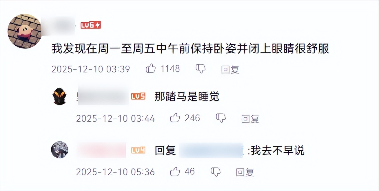 有人发现,周一到周五的午前,在工位上把上下眼皮合在一起会很舒服,如果在自家的床上并保持卧姿会更舒服。