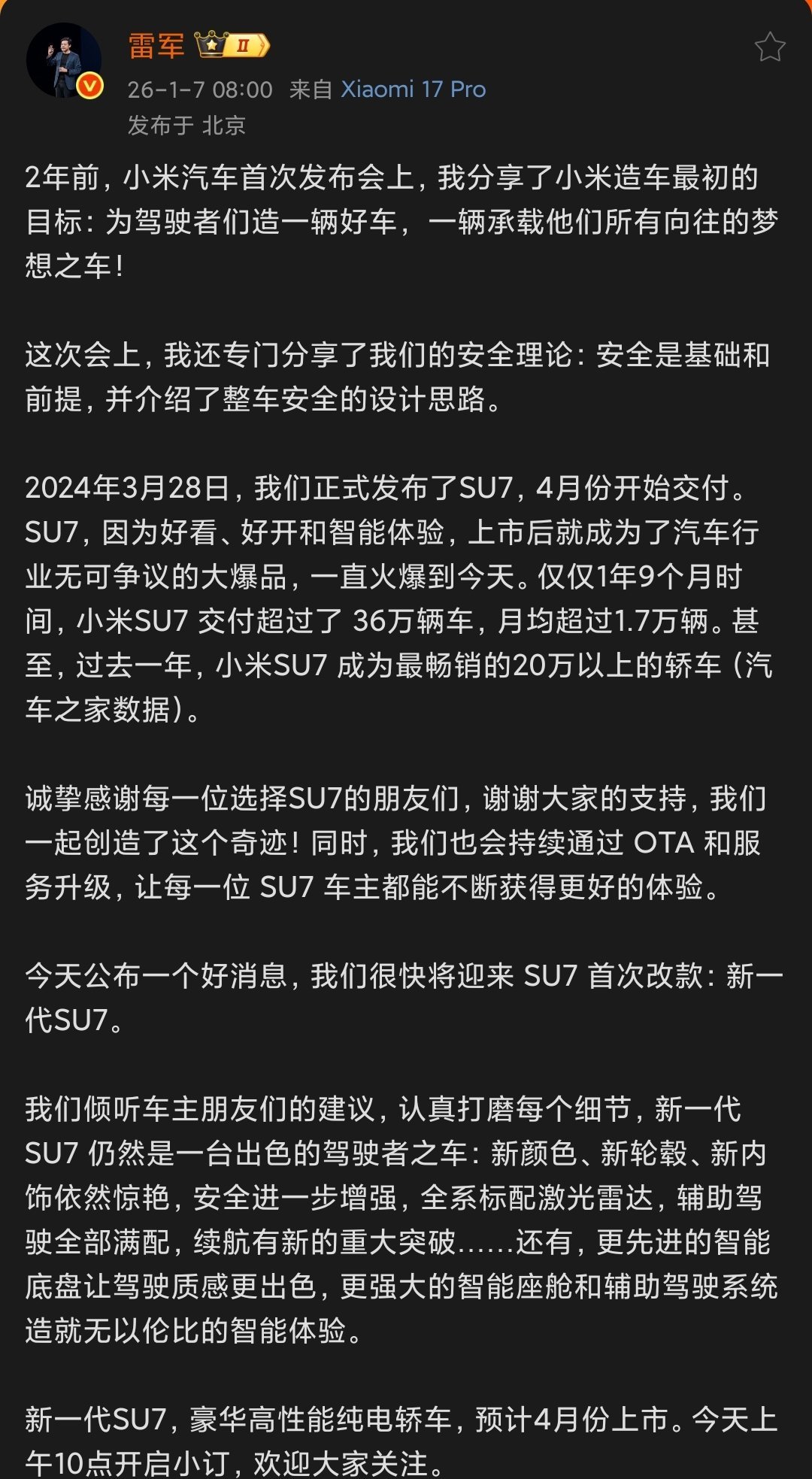 不知道大家對新款su7感覺如何?能否再次創造老款su7的奇蹟呢?
