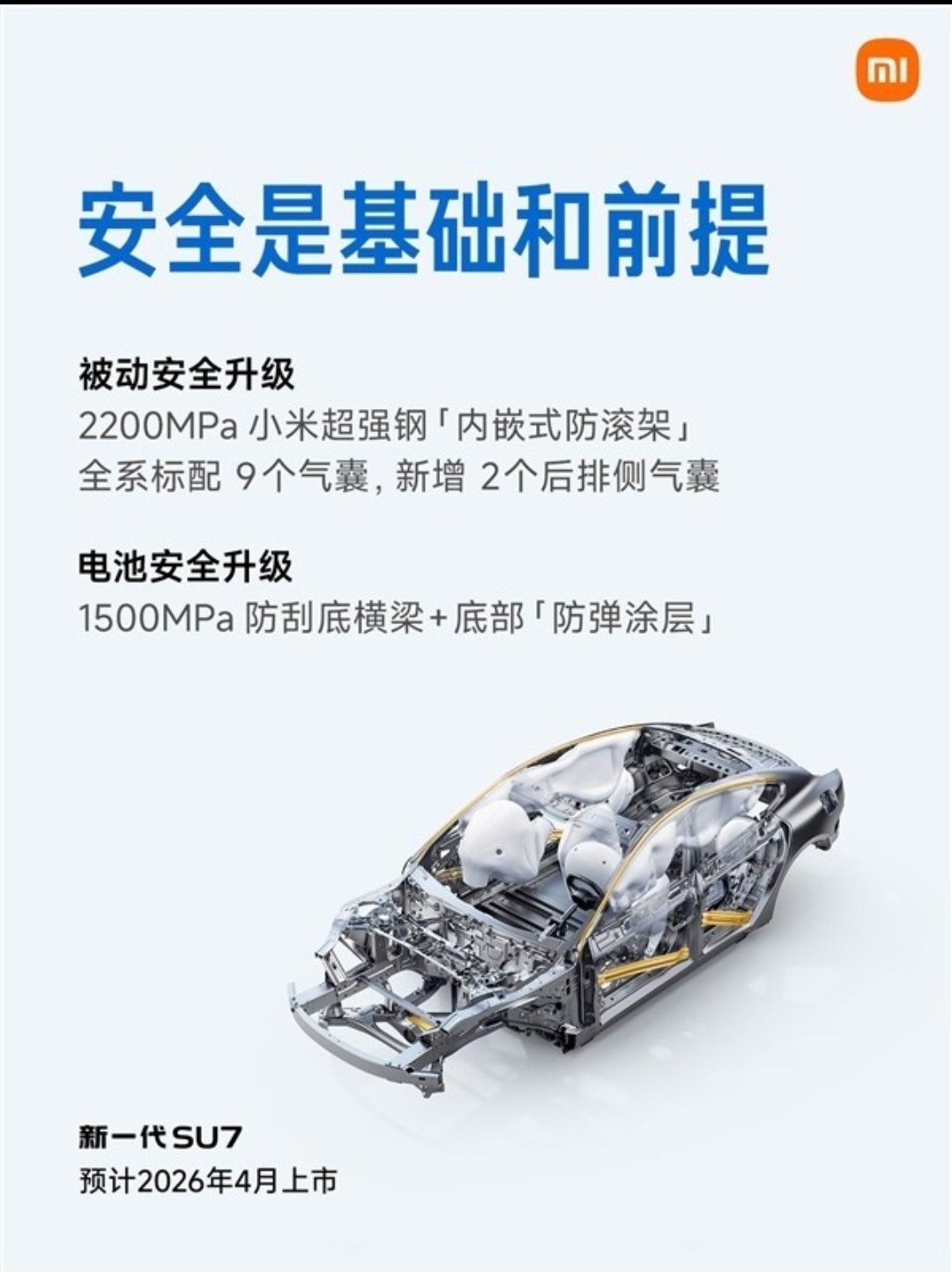 在今天小米發佈的一些宣傳照片中,也表示新款SU7的安全是基礎和前提,且安全冗餘實現了進一步提升。被動安全上,新車採用2200MPa小米超強鋼打造「內嵌式防滾架」,車身抗衝擊能力大幅增強;