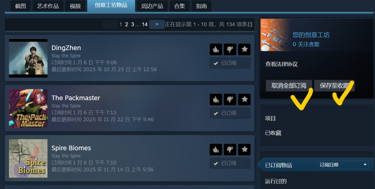目前我的mod刚过100,还不用用大型管理器,做法如图:先找到喜欢的mod订阅,然后一键保存至收藏,最后一键清空【取消全部订阅】,这样就可以去收藏夹找到自己订阅历史,用一个订一个。