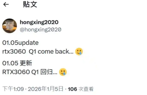 英伟达已更新 GPU 供应计划,帮助合作伙伴于2026年第一季度恢复 GeForce RTX 3060 生产并重返零售市场,预计1月中下旬至2月上旬迎来首批到货,此次重启以 8GB 显存版本为主,为当前 DRAM 显存短缺危机下的中端显卡市场提供更多的选择,也能为NVIDIA带来更多的利润。