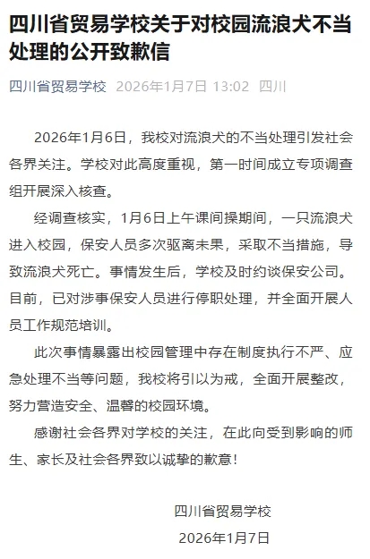 事件发生在1月6日上午的课间操期间。当时,一只流浪犬进入校园,保安人员在多次驱离未果后,采用了不当方式进行处置,使用了棍棒处理,最终导致流浪狗死亡。