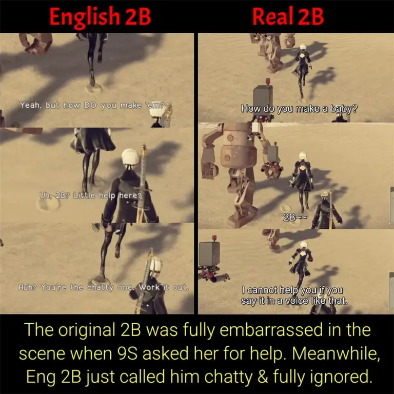这场争论的核心集中在支线任务的对话细节中。最具代表性的一幕是:9S被机械生命体追问“小孩是怎么生出来的?”而慌张求救时,日文版的2B回应得有些不知所措,还带着几分害羞:“就…就算你用那种声音求我,我也帮不了你”,语气里满是少女般的无措,与她平时冷静的战斗姿态形成反差萌;但在英文版中,这句台词被改成了“你话太多了,自己想办法”(You’re the chatty one. Work it out),语气冷淡表示了拒绝,完全没有了原版的温柔特质。