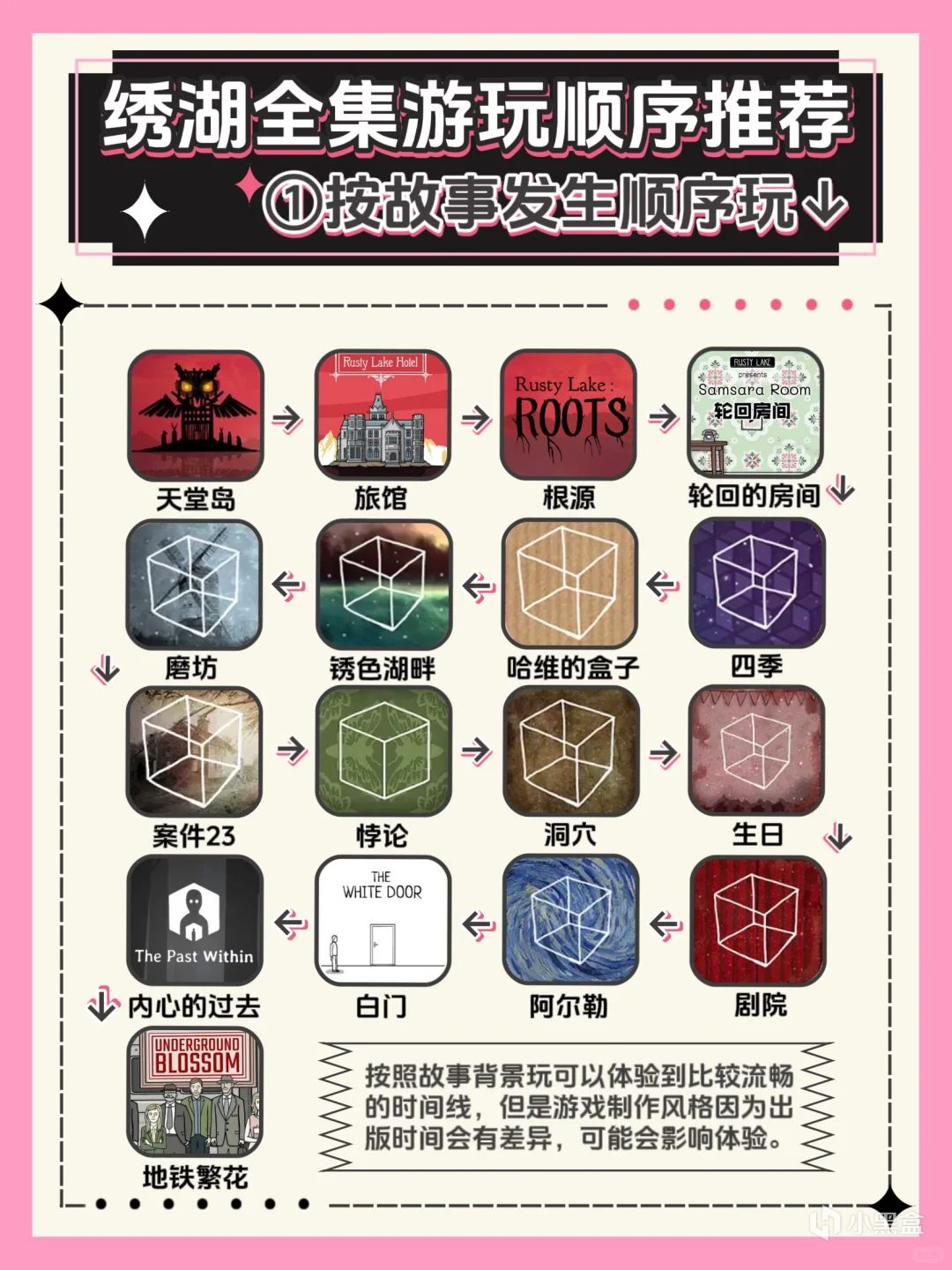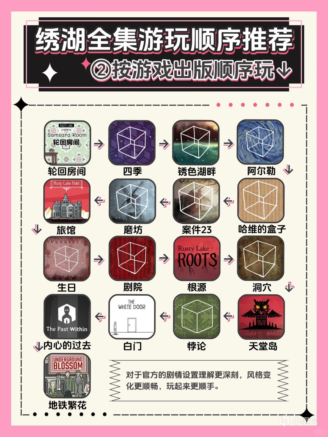 游玩顺序:四季→哈维的盒子→锈湖湖畔→磨坊→案件23→悖论(需单独购买)→洞穴→生日→剧院→阿尔勒