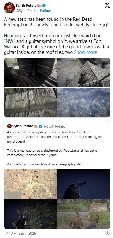 随着Reddit社区玩家集结梳理,以及知名内容创作者Strange Man的系统汇总,蜘蛛网之谜的解谜脉络逐渐清晰。当玩家站在蜘蛛符号的中心位置时,一张巨大的蜘蛛网会显现出清晰的字母“N”,明确指引玩家向正北方向进发。遵循指引抵达正北方向的电报杆后,射击杆子会解锁隐藏提示,要求玩家继续向西行进并依次射击5根电报杆。完成这套方位+射击的连招后,最新线索指向了华莱士堡(Fort Wallace)西北方的一座瞭望塔。正如推特用户Synth Potato在社交平台分享的实证内容所示,塔内不仅藏有一把吉他,屋顶瓦片上还浮现出一组神秘的鸟类符号,结合此前的指引逻辑,这组符号疑似暗示下一站仍需向北方探索。不过截至目前,全球玩家均卡在这一环节,关于吉他的使用方式、鸟类符号的解读尚无实质性突破。