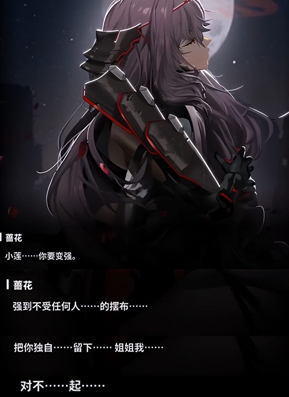 一直坚信万物没有永恒的蔷花,唯独为了妹妹破例了。她一次次的询问红莲的决心,听到她说着自己会人类的荣耀战斗至死亡,永远不变之后,仿佛松了一口气一般,说着小红莲终于长大了,将自己心中里的挣扎搪塞了过去,妹妹的愿望已经收到了啊,作为姐姐,就该去好好守护她了,那么,如果一定要留下来只活一人的话,蔷花选择把生的希望留给名额,她的心中有无数天平在反复倾斜,在踏入指挥官室的那一刻,她下定了决心,要守护什么,要放弃什么。