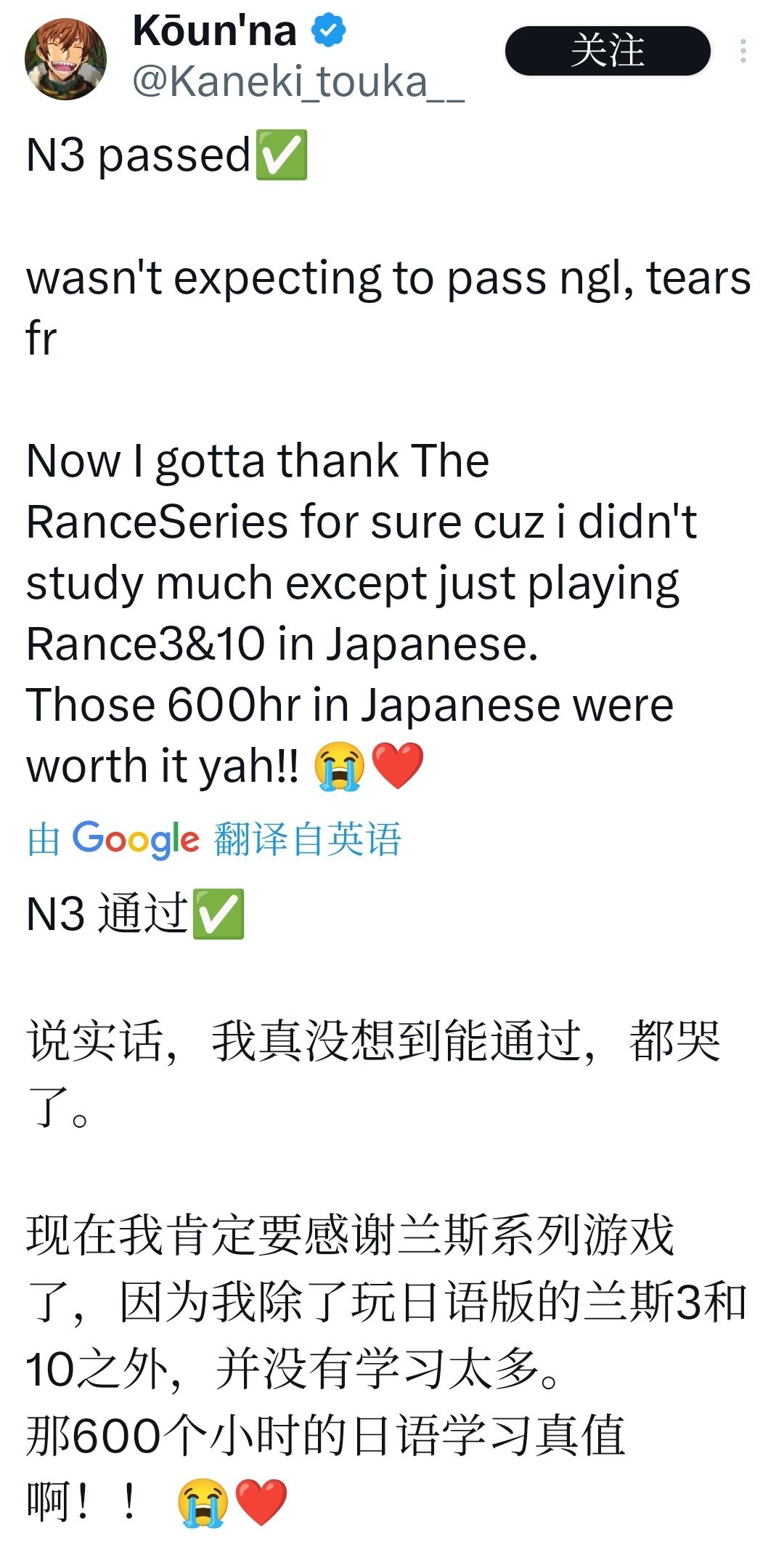 当事人说法备考期每日沉浸 10–12 小时,游戏为“破天荒战士与女奴隶”为主角的长期系列,且该玩家自述“未做额外学习也能通过 N3”。