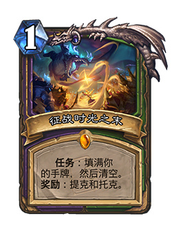 法师 + 战士?德鲁伊 + 恶魔猎手??术士 + 猎人?!时光危机搅乱了一切,诞生了各种离奇古怪的新搭配。试试“征战时光之末”,这是一张猎人/术士双职业任务卡牌,奖励强力随从“提克和托克”。打出它即可补满手牌,然后看着它的亡语效果将你对手的手牌彻底抹除!