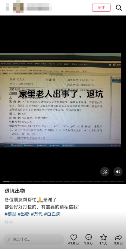 事情的起因其實並不複雜。12月初,有一位網友——我們這裏稱其爲酸辣粉——在抖音上發佈了一條求助視頻,向大家展示診斷證明,稱自己家裏老人突然生病、着急用錢,打算將自己手裏的模型打包出售,以解燃眉之急。
