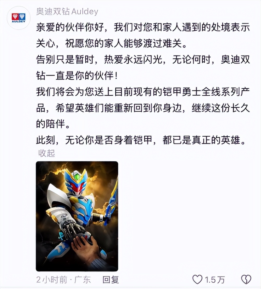 雖說酸辣粉所出售的模型裏基本沒有奧迪雙鑽的,但本着天下膠佬是一家的態度,聽聞這件事的奧迪雙鑽官號,還是善意地出現在評論區中:他們對這位網友的處境表示關心,並決定贈送“鎧甲勇士”全線系列產品——大概想要表達的,就是即便酸辣粉因一時窘境退坑,但鎧甲勇士們依舊會陪伴着他。