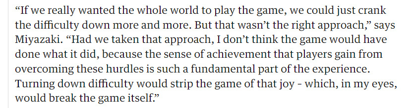 宫崎英高直言,“如果真的这样做,游戏不可能取得如今的成就——玩家攻克难关时获得的成就感,是游戏体验的根本。降低难度会剥夺这种乐趣,在我看来,这等同于毁掉整个游戏。”