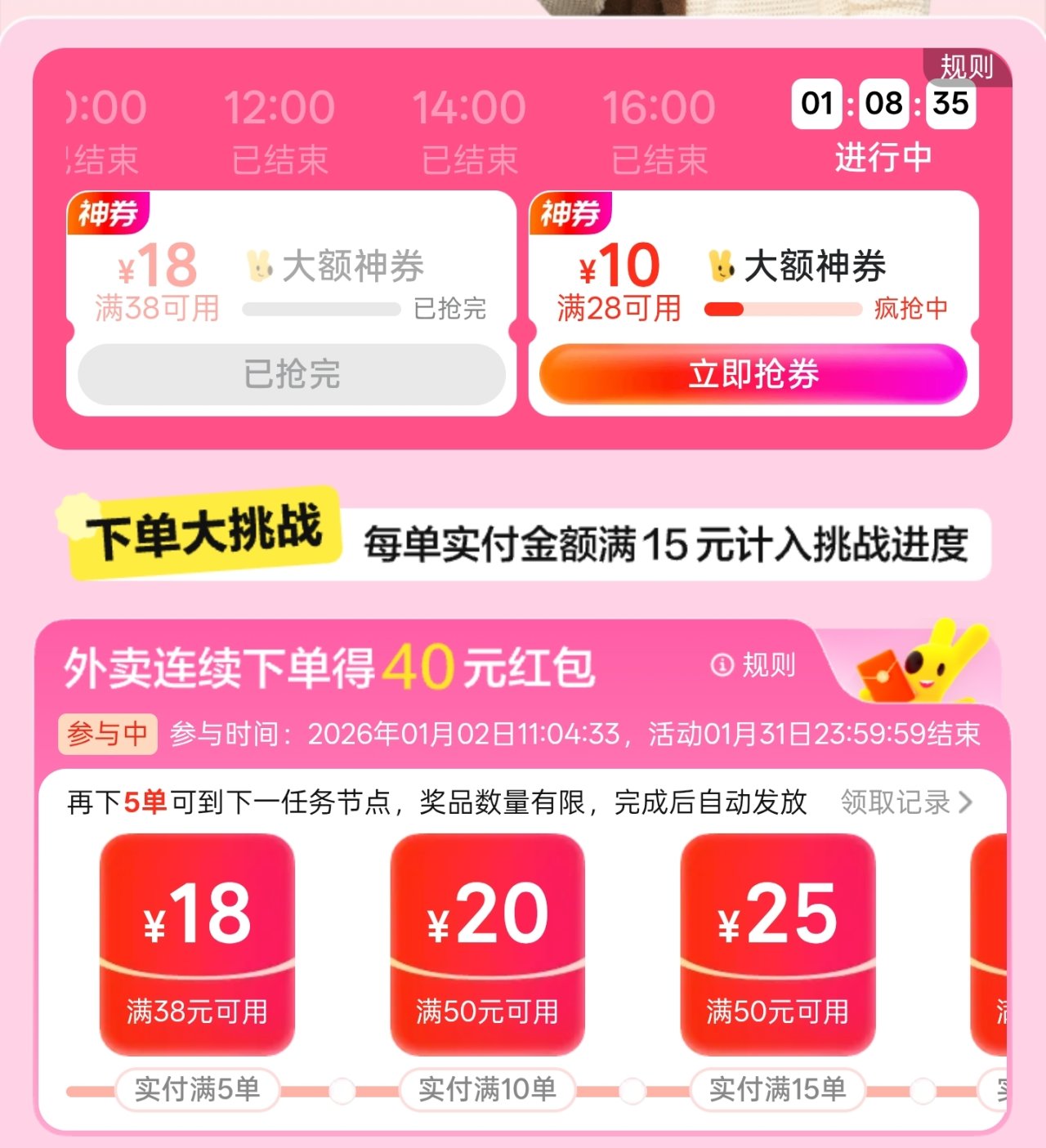 美团-外卖-中间有个连续下单,点进去,固定时间可以抢38-18,这个券也可以用不过要抢