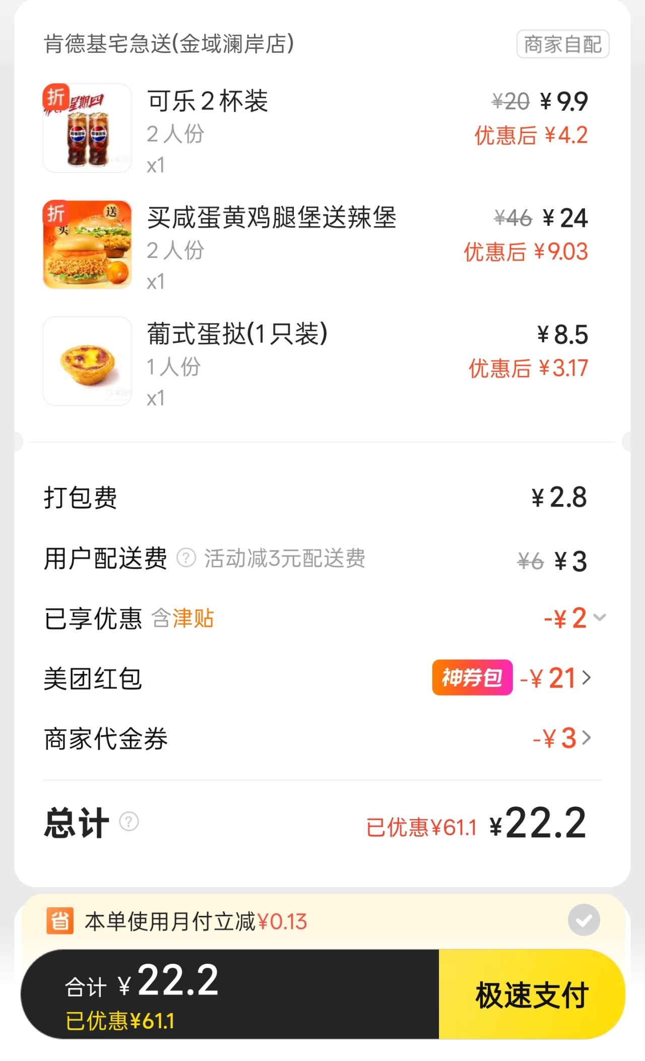 商家券和津贴并不是必选项而是加分项哈,如果店铺没有商家券或者刷不出津贴,直接领这些券买其实也就贵几块钱,这些券也不止肯德基能用,也可以尝试凑凑别的