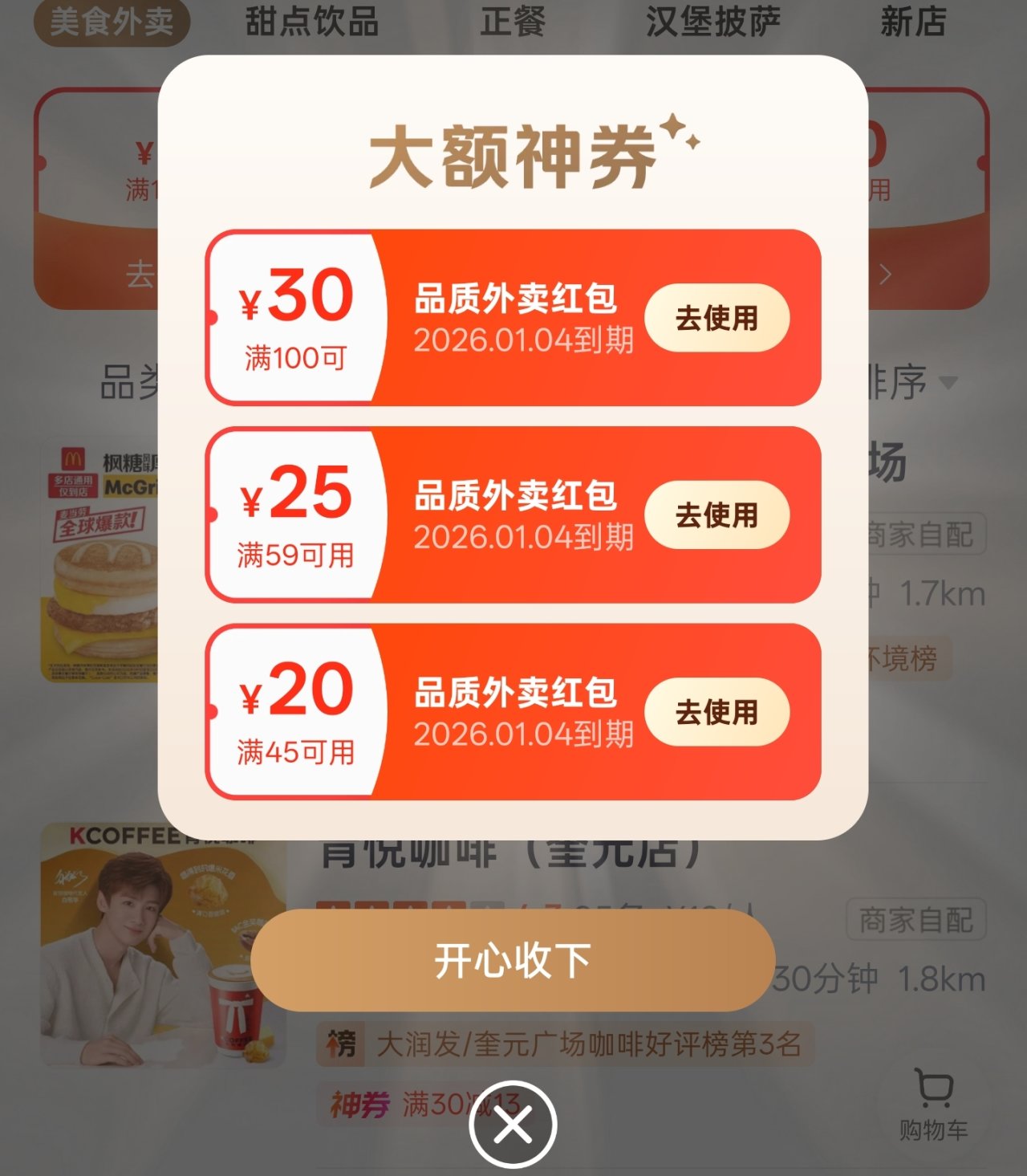 首先我们打开大众点评,搜索:品质外卖,会弹出一排券,59-25/45-20等