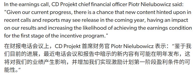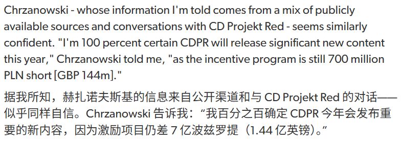 曾於上月預測DLC將於五月以30美元價格發佈的赫扎諾夫斯基認爲,該"激勵計劃"將推動公司於今年發佈內容,因管理層可通過增發股份獲益。值得注意的是,除"公開信息來源"外,據稱其與CD Projekt RED亦有直接溝通。