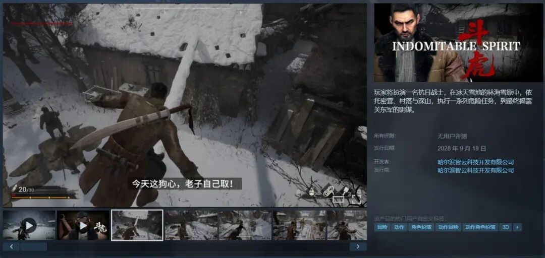 《斗虎》(INDOMITABLE SPIRIT)在Steam上的定位是冒险/动作类生存游戏,叙事从1931年九一八事变后东北沦陷展开。开发与发行主体显示为哈尔滨智云科技开发有限公司,商店页给出的计划发售日期非常靠后,整体更像先挂着占位的状态。