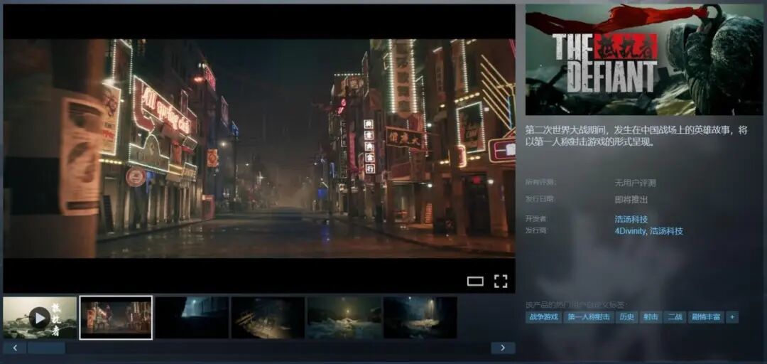 《抵抗者》(The Defiant)走的是另一套产品化思路。Steam页面显示开发者为浩汤科技,发行为4Divinity,发售日期同样待定。它被反复强调的卖点,是在第一人称射击的底子上加了谍战、解谜等混合要素,用更任务化的结构来承载体验。发行层面的合作关系也有正式披露。