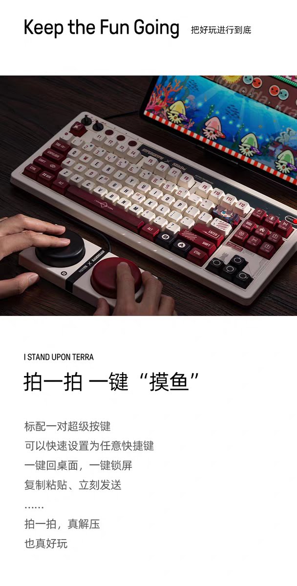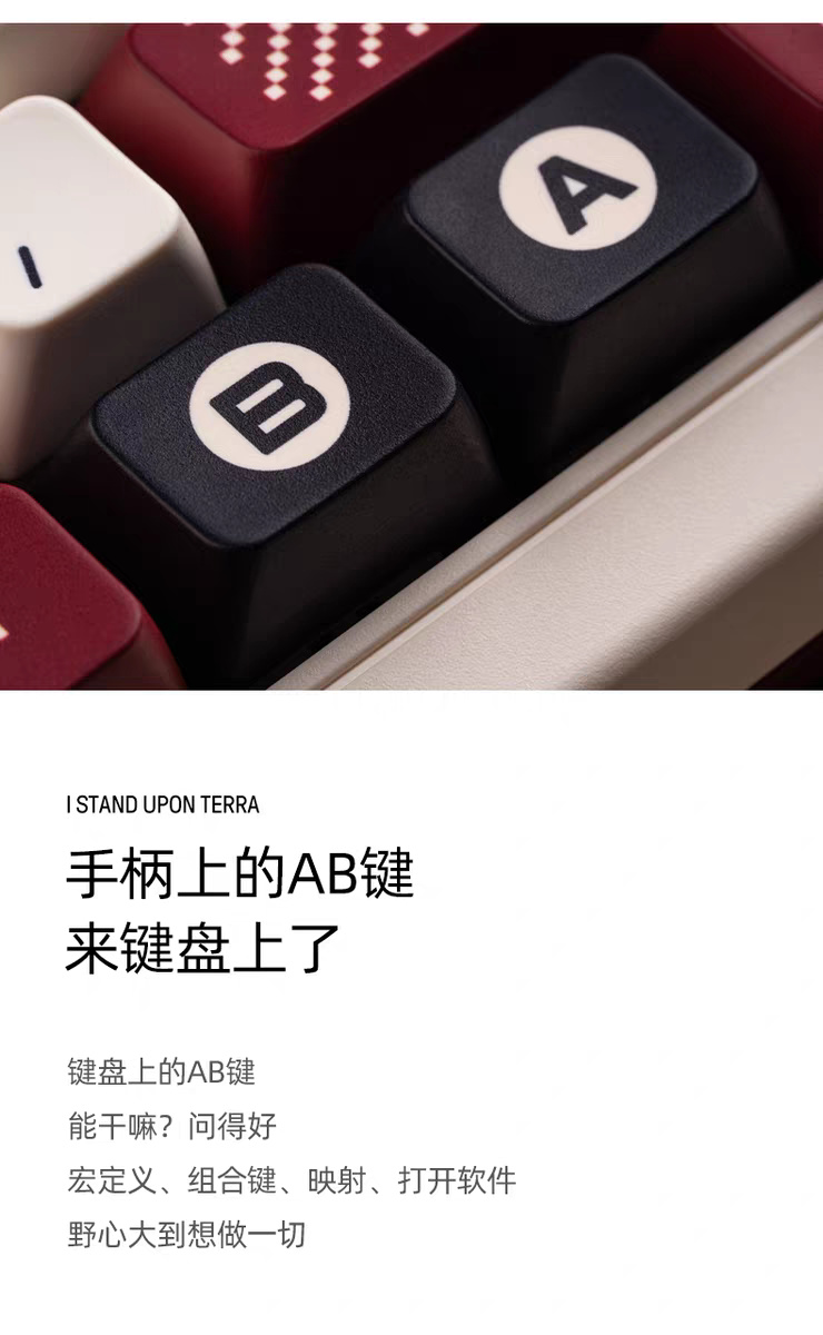 包含了增補鍵帽、春聯、紅包、冰箱貼、文化貼紙,以及2個拍拍鍵可以設置爲任意按鍵。鍵盤上面還有2個任意的ab鍵可以設置宏定義、組合鍵、映射、打開軟件等。