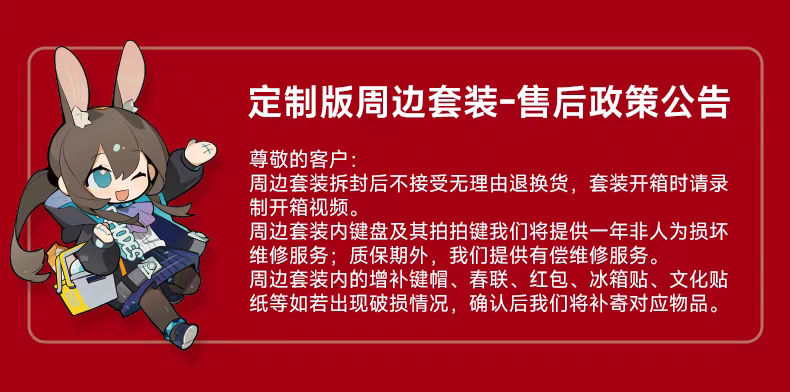 周邊套裝內鍵盤及其拍鍵提供一年非人爲損壞維修服務;質保期外,提供有償維修服務。周邊套裝內的增補鍵帽、春聯、紅包、冰箱貼、文化貼紙等如若出現破損情況,確認後將補寄對應物品。