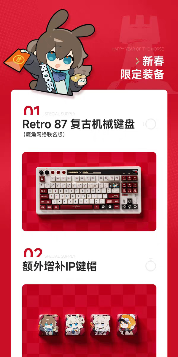鷹角網絡×八位堂 Retro 87 復古鍵盤新春聯名周邊套裝現已上架【八位堂旗艦店】,預售將於1月9日晚20點正式開啓,首發價格 499 元。原價599。