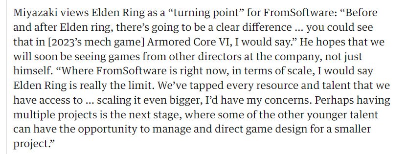 “就 FromSoftware 目前的规模而言,我认为《艾尔登法环》才是真正的极限。我们已经利用了我们能接触到的每一种资源和人才……如果再进一步扩大开发规模,我会比较担心。也许公司的下一个阶段是同时进行多个项目,其他一些年轻人才可以有机会管理和指导小型项目的游戏设计。”