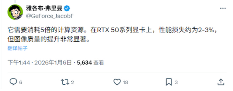 DLSS 4.5新模型对Tensor Core的计算需求大幅提升,大约是之前的5倍,因此要完全发挥它的效果,需要硬件支持FP8运算精度——目前只有RTX 40和50系列能够满足。而RTX 20和30系列的Tensor Core不支持FP8,运算资源上会有些吃紧,虽然也能用,但可能无法跑满全部潜力。