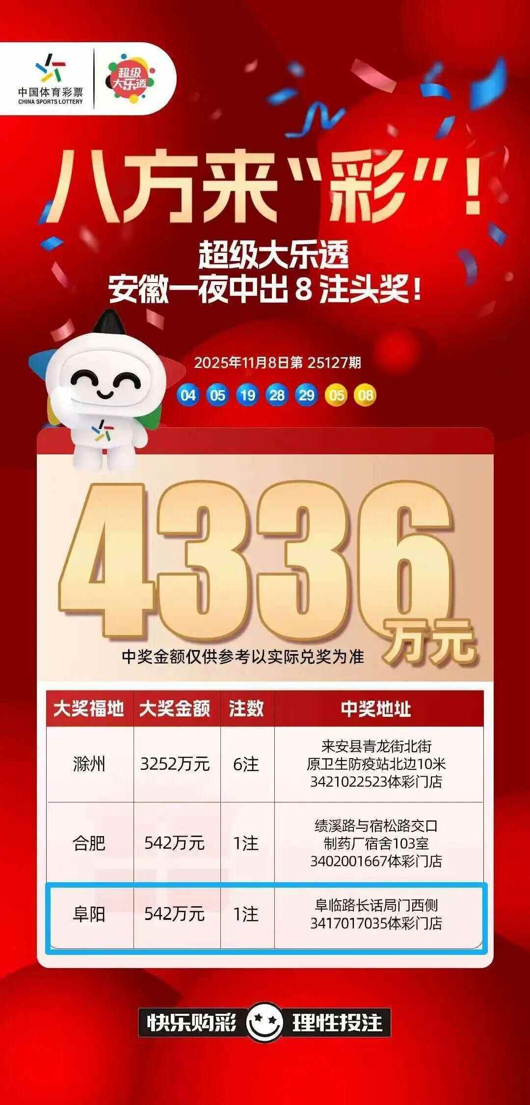 依据安徽省体育彩票管理中心对外公布的信息显示,这542万元大奖出自阜阳市3417017035体彩销售点(具体位于颍州区阜临路长话局大门西侧),中奖奖项为大乐透第25127期,中奖号码组合为:04 05 19 28 29+05 08。自2025年11月8日开奖当日起算,兑奖的60个自然日有效期现已届满。